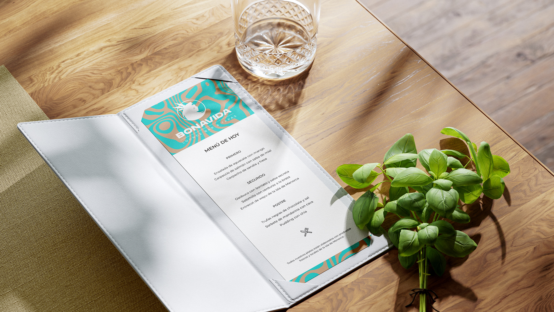 La elección de colores hace referencia al turquesa del mar y al color arena presente en la isla. Los elementos gráficos combinan los colores corporativos en formas orgánicas y psicodélicas que contrastan con la geometría del logotipo y recuerdan a la interacción del mar cuando se filtra entre la arena.