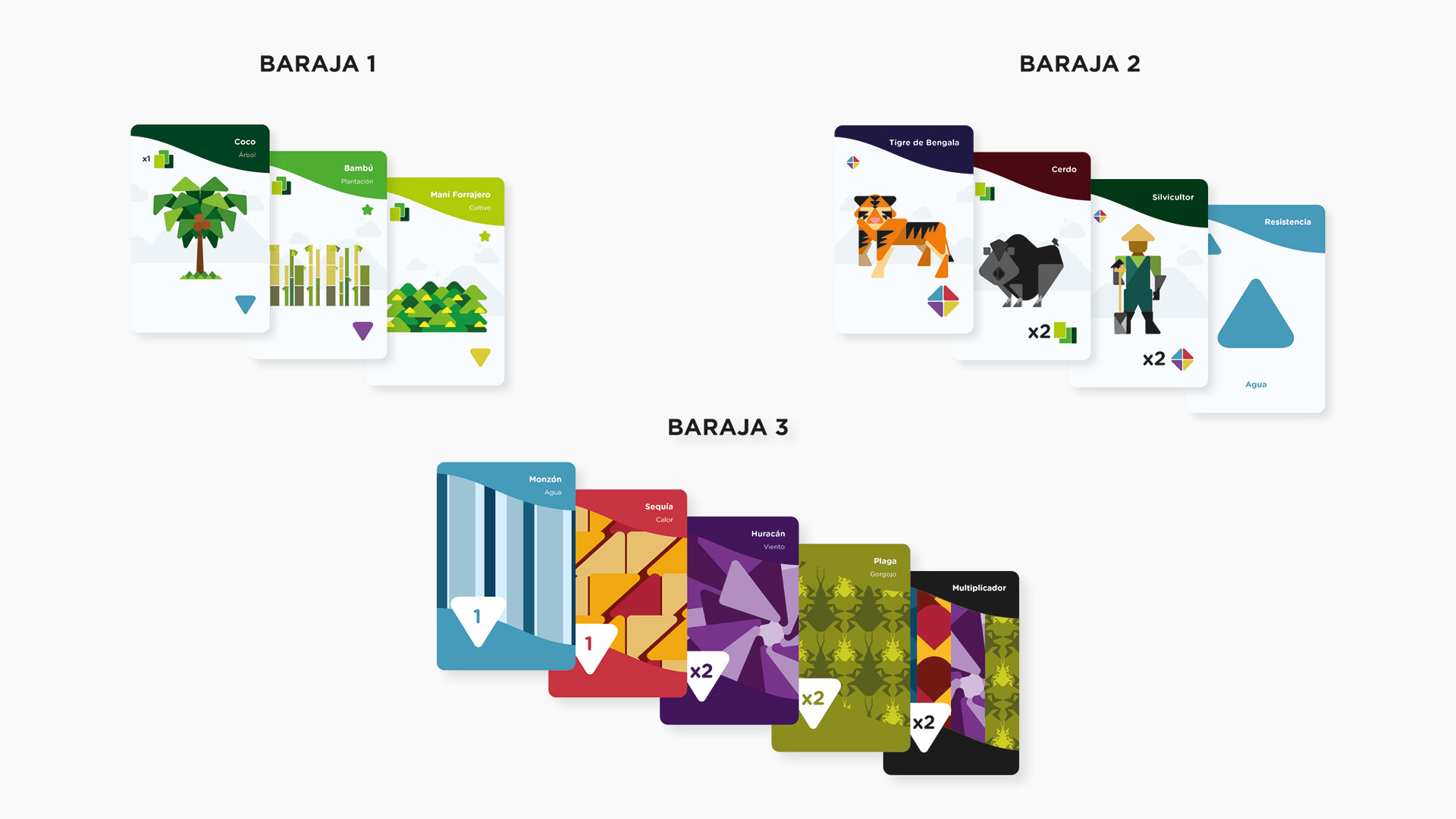 Dentro de cada baraja existen diferentes categorías diferenciadas por color.