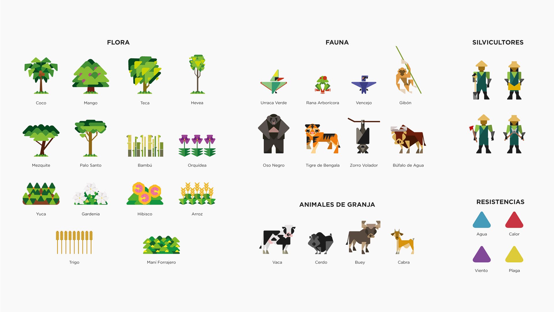Las ilustraciones están hechas a partir de formas básicas, dando una especial importancia al triangulo. Los vértices redondeados son importantes para conseguir formas más amables.