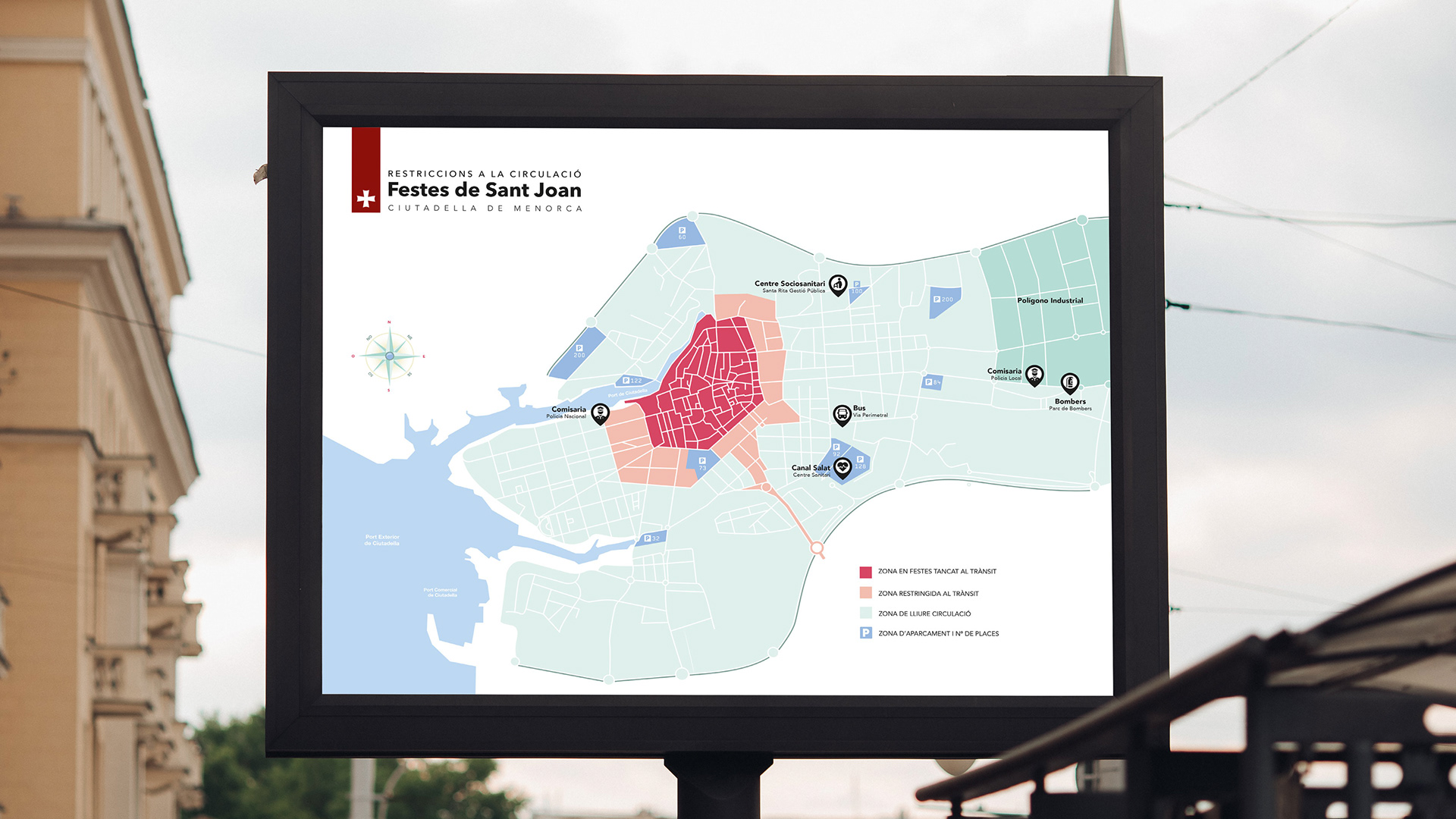 Ilustración del mapa y señalización de las restricciones para las fiestas de San Juan de Ciudadela de Menorca.